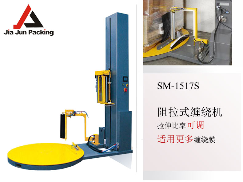 阻拉式纏繞機是指通過調(diào)節(jié)阻拉伸機構(gòu)的摩擦阻尼,使纏繞膜被動拉出時的速度慢于托盤貨物轉(zhuǎn)動的速度,進而在纏繞膜被拉開的同時裹繞到貨物之上的纏繞膜包裝機。因為可以將阻尼調(diào)節(jié)為“零”,所以任何品質(zhì)的纏繞膜或普通塑料膜均可以使用。為了增強纏繞包裝的穩(wěn)定性,在包裝尺寸范圍內(nèi)使用。