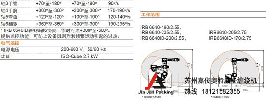 嘉俊以下機器人碼垛機所有型號均可額外增加荷重。上臂額外荷重50kg(ID型除外),第一軸框架額外荷重250kg。軸數(shù)為6,防護等級是整機IP67,安裝方式為落地式。其性能:重復(fù)定位精度0.07mm,重復(fù)路徑精度0.7mm。后道包裝流水線與其生產(chǎn)的纏繞機、開箱機、封箱機一樣,均采用高品質(zhì)配件。